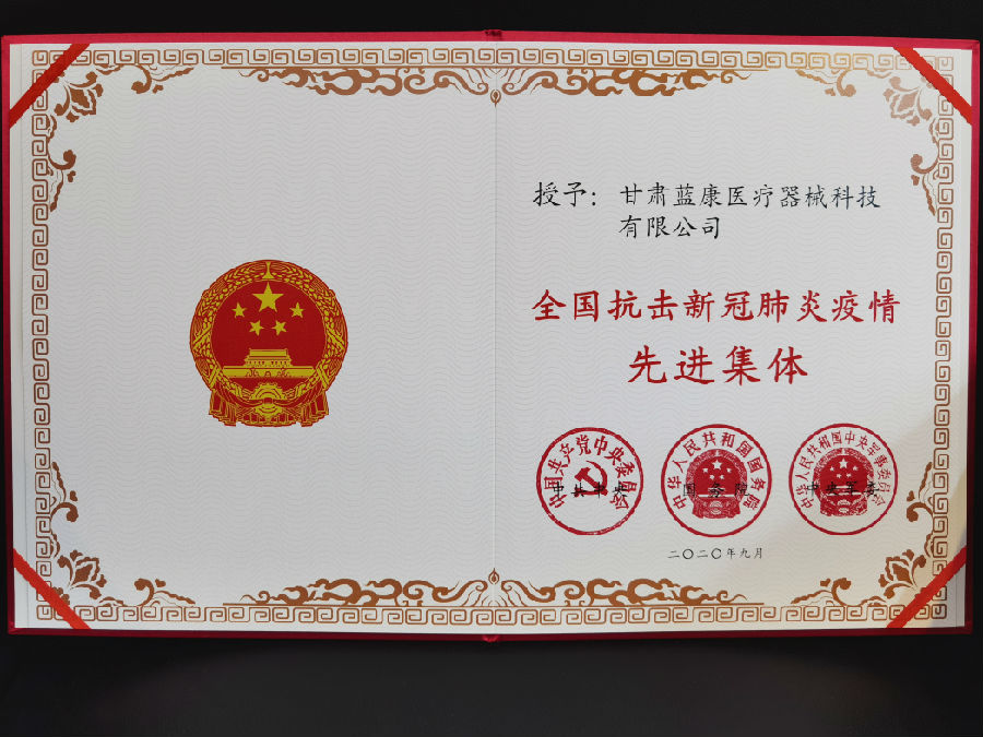 甘肅藍康醫療器械科技有限公司 榮獲“全國抗擊新冠肺炎疫情先進集體”榮譽稱號